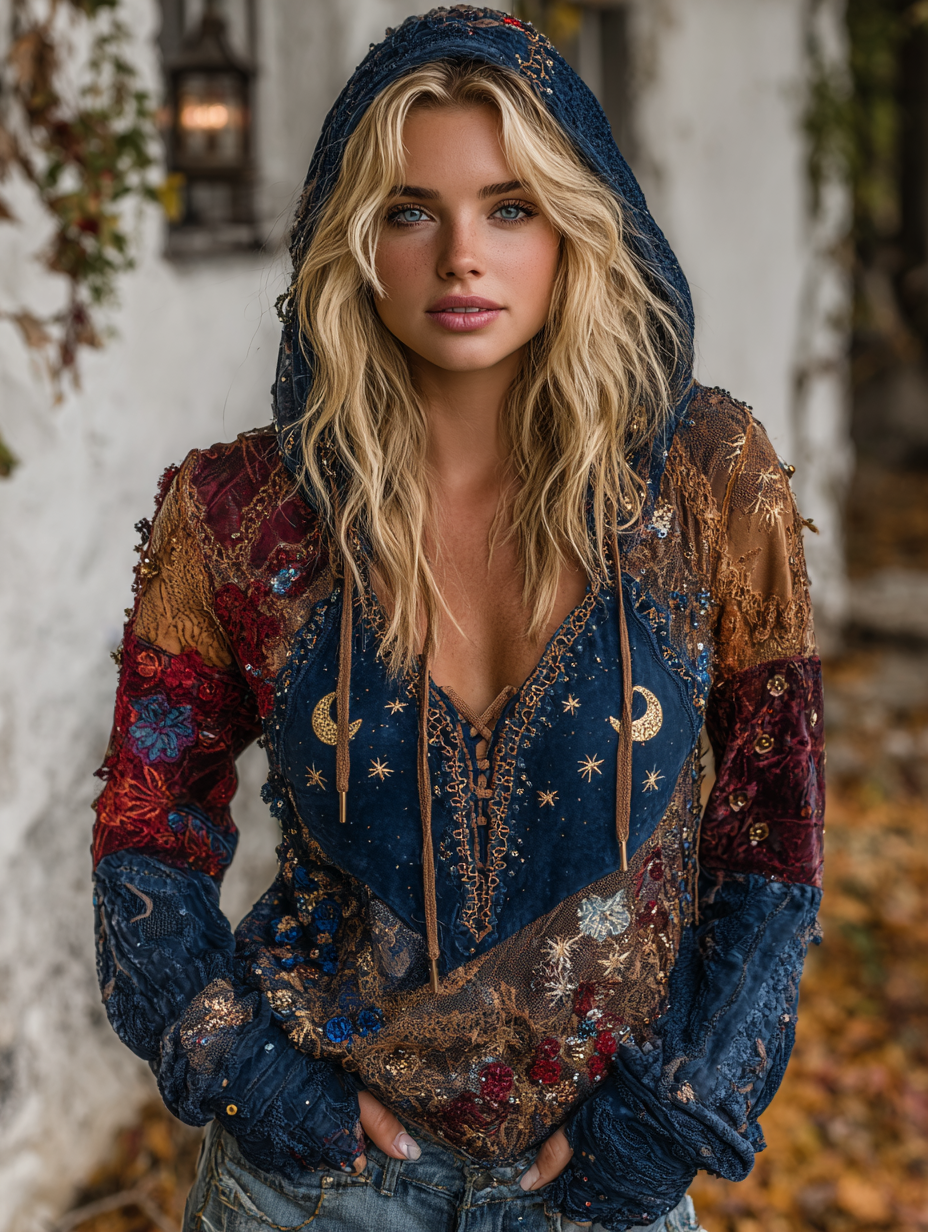 AUTUMN AND WINTER FASHION PATCHWORK CONTRAST COLOR LACE HOODED SWEATSHIRT 66a8