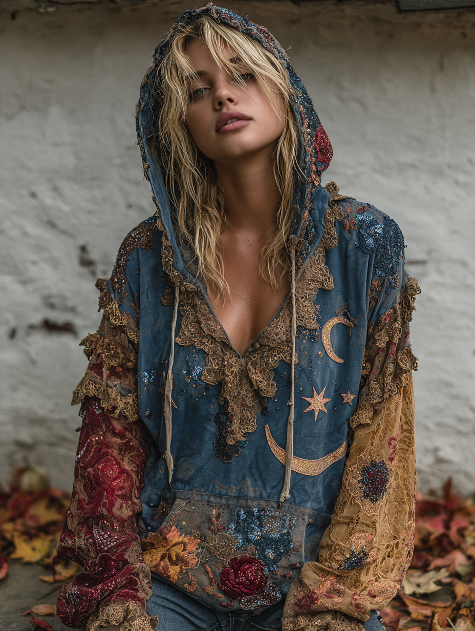 AUTUMN AND WINTER FASHION PATCHWORK CONTRAST COLOR LACE HOODED SWEATSHIRT 9b85