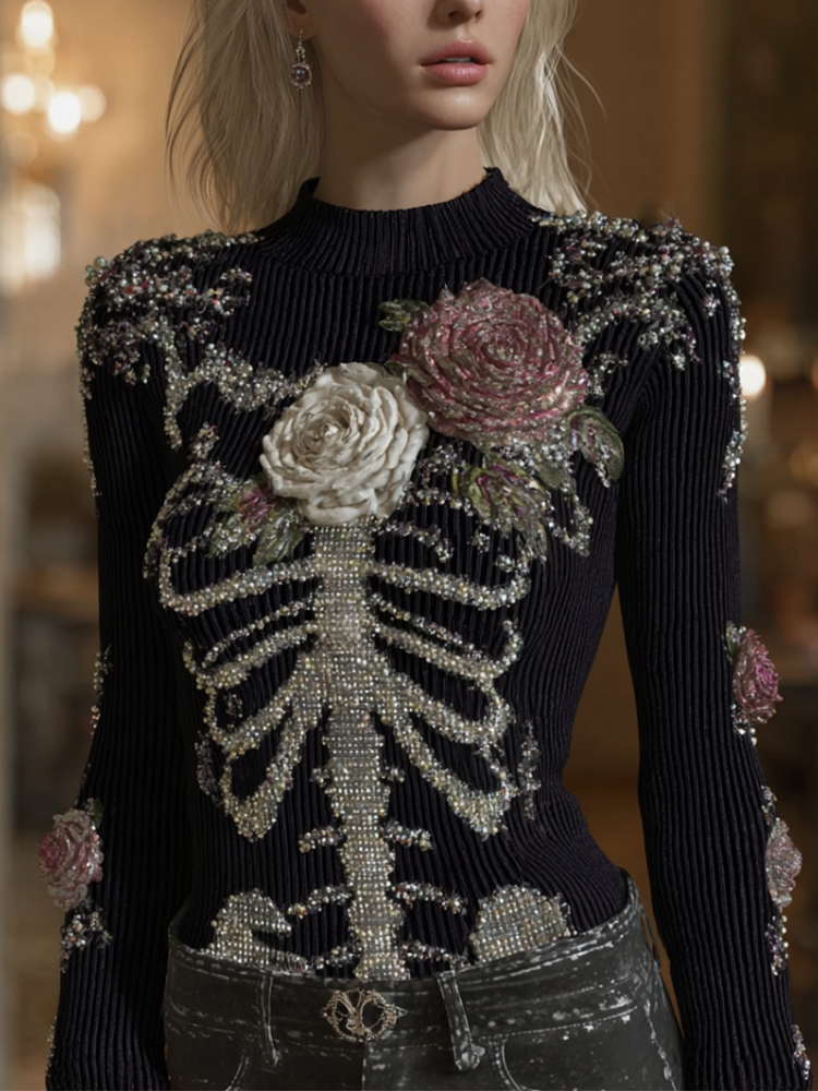 Halloween Human Anatomy Style Bone Pattern And Flower Pattern Combined Design Women's Round Neck Knit Sweater