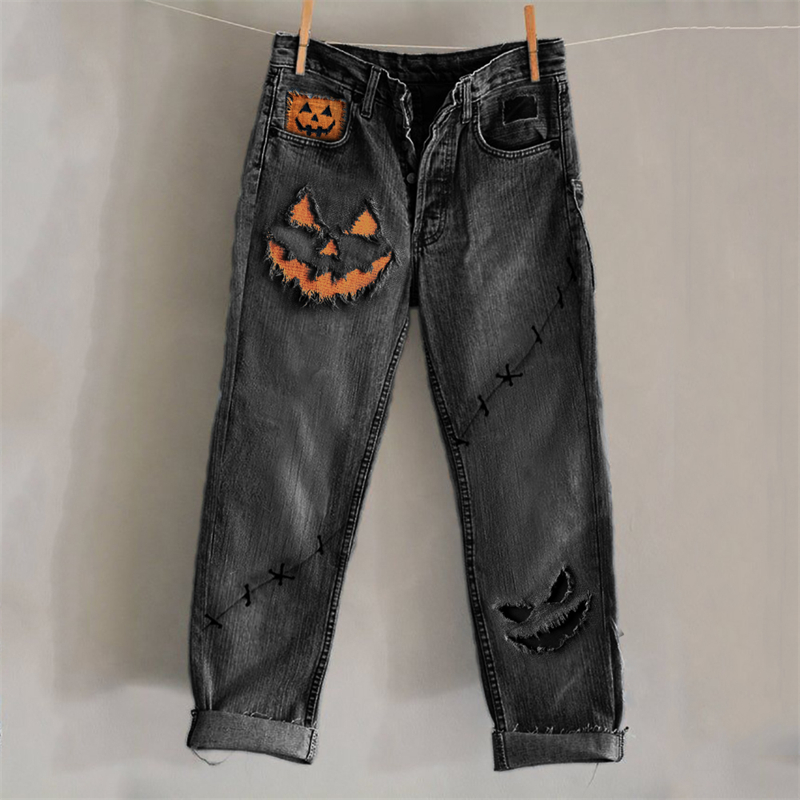 Halloween Pumpkin Faces Cutout Stitched Washed Jeans