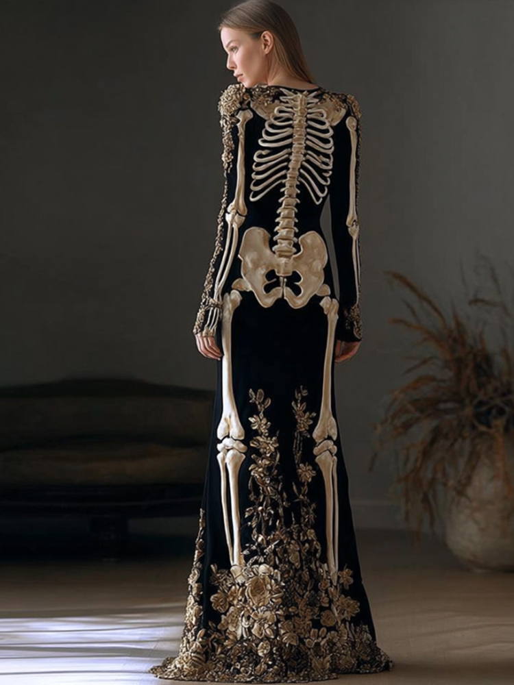 Halloween Retro Anatomy Art And Flower Velvet Long Dress