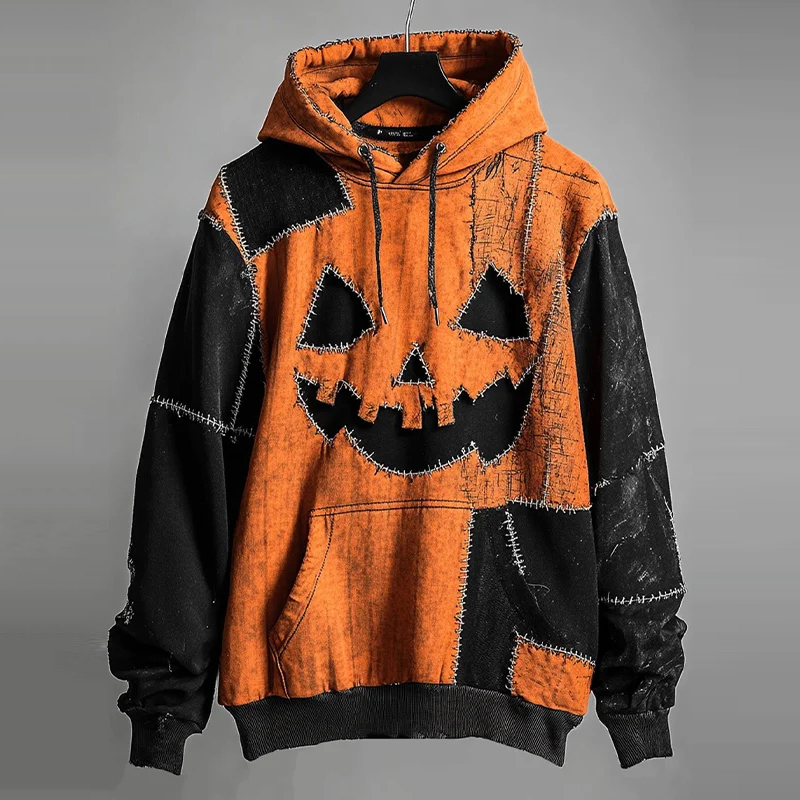 Men's Halloween Ghost Face Pumpkin Patchwork Art Contrast Graphic Warm Hoodie