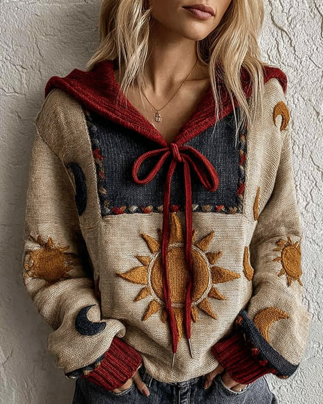 Star and Moon 3D Embroidery Contrast Color Patchwork Knitted Hooded Sweater ce46