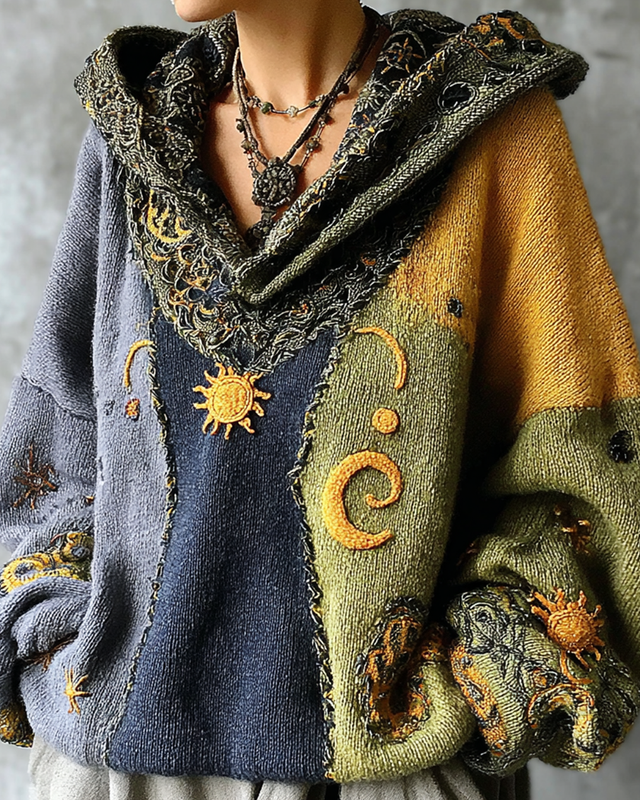 Women's star-moon themed embroidered gradient color stitching hooded sweaterr 97db