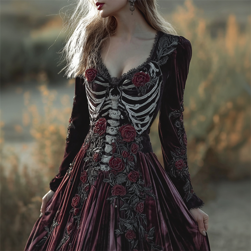 Vintage Skeleton Red Roses Cozy Velvet Maxi Dress