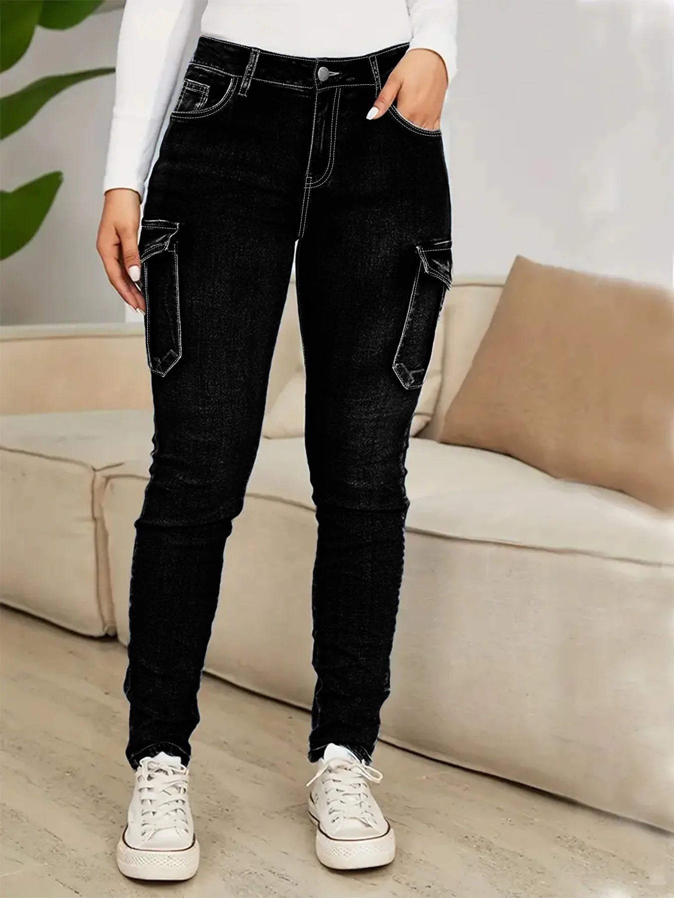 White Line Pocket Black High-Waist Pants – Sleek & Streetwear Ready