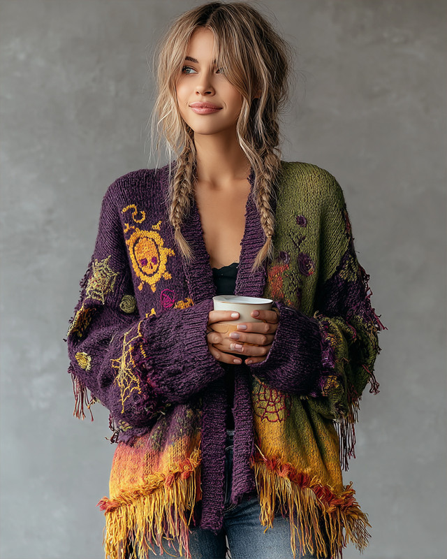 Women's Halloween Theme Pumpkin Embroidered Gradient Cardigan 1655