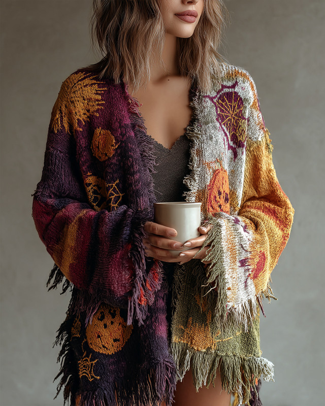 Women's Halloween themed pumpkin head embroidered tie-dye gradient cardigan 61d7