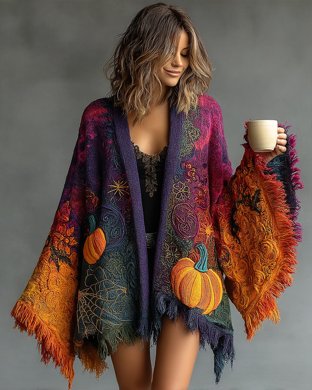 Women's Halloween themed pumpkin head embroidered tie-dye gradient cardigand53f