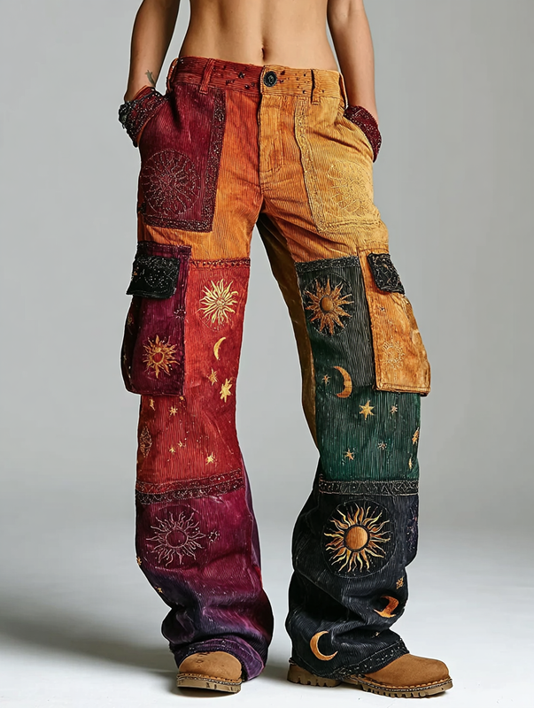 Women's Star and Moon Embroidered Contrast Color Stitching Pants 09bb