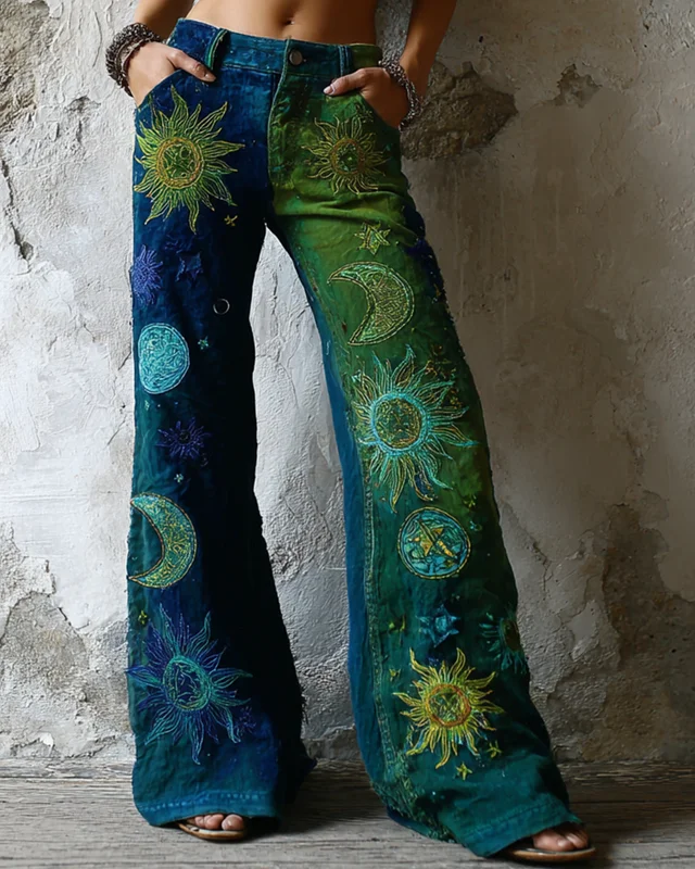 Women's star and moon embroidered gradient tie-dye trousers 2062