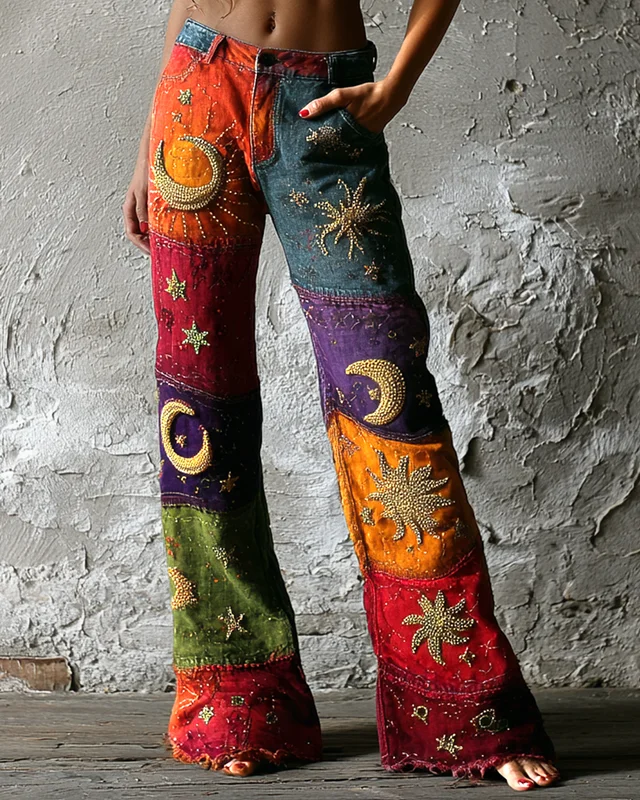 Women's Star and Moon Embroidered Contrast Color Stitching Pants 5620