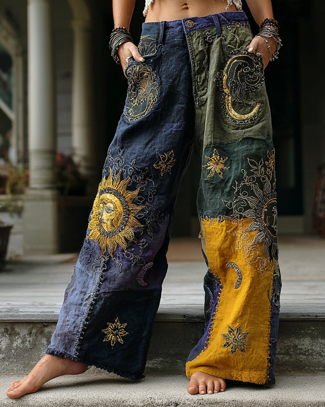 Women's Star and Moon Embroidered Contrast Color Stitching Pants 71fa