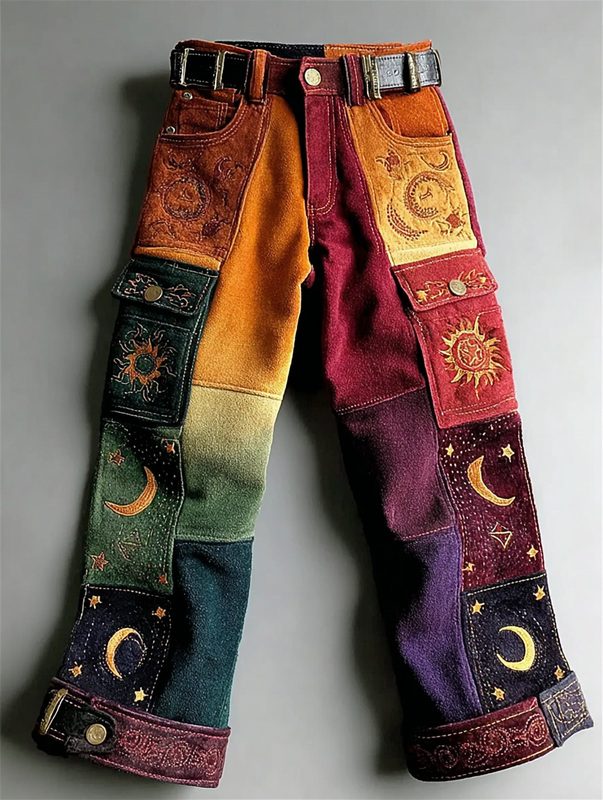 Women's Star and Moon Embroidered Contrast Color Stitching Pants 84ca