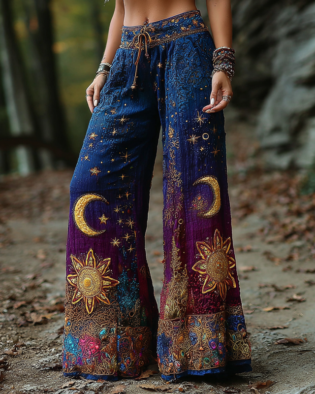 Women's star and moon embroidered gradient tie-dye trousers 92aa