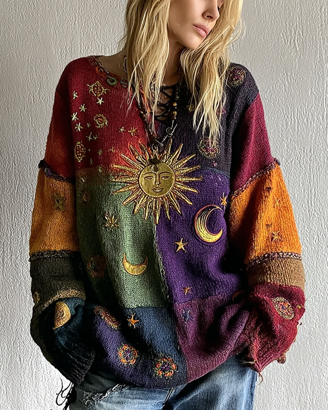 Women's Star and Moon Embroidery Sweatshirt with Contrast Stitching 112f