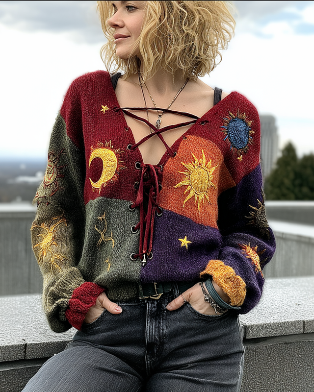 Women's star and moon embroidery contrast color stitching chest tie design irregular top 8c3b