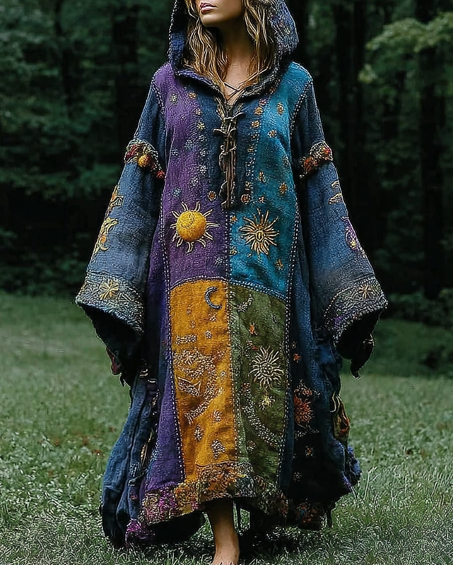 Women's star and moon embroidery contrast color stitching hooded kaftan df8a