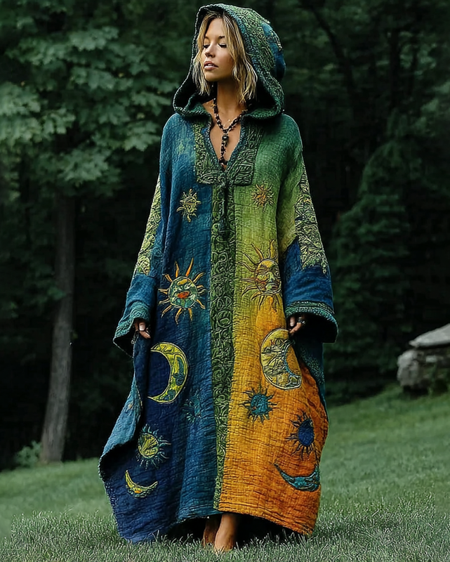 Women's star and moon embroidery contrast color stitching hooded kaftan f82d