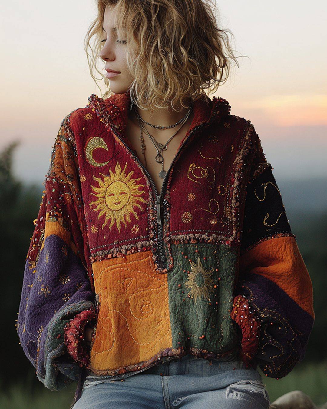 Women's Star and Moon Embroidered Contrast Color Panel Hoodie 1075