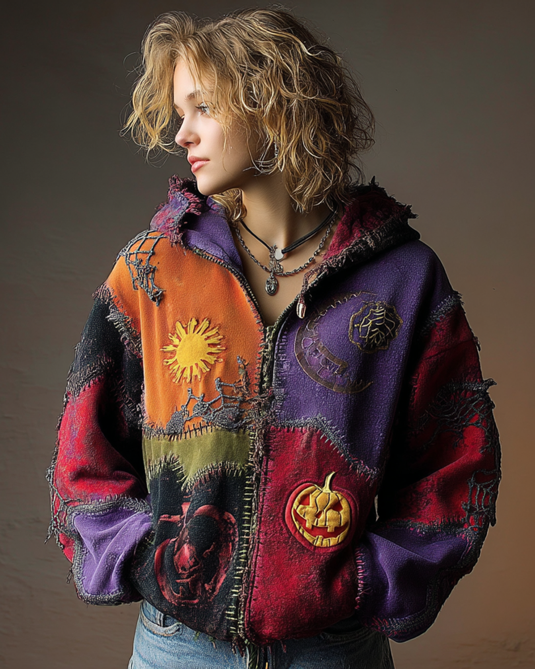 Women's Star and Moon Embroidered Contrast Color Panel Hoodie 3b3f