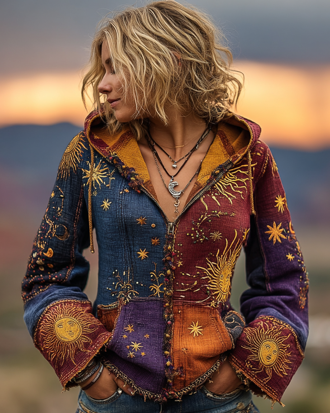 Women's Star and Moon Embroidered Contrast Color Panel Hoodie 3ef5