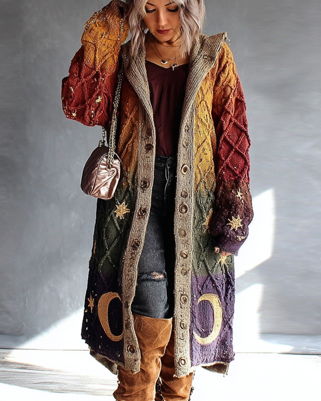 Women's Star and Moon Embroidered Tie-Dye Gradient Knit Cardigan 8334