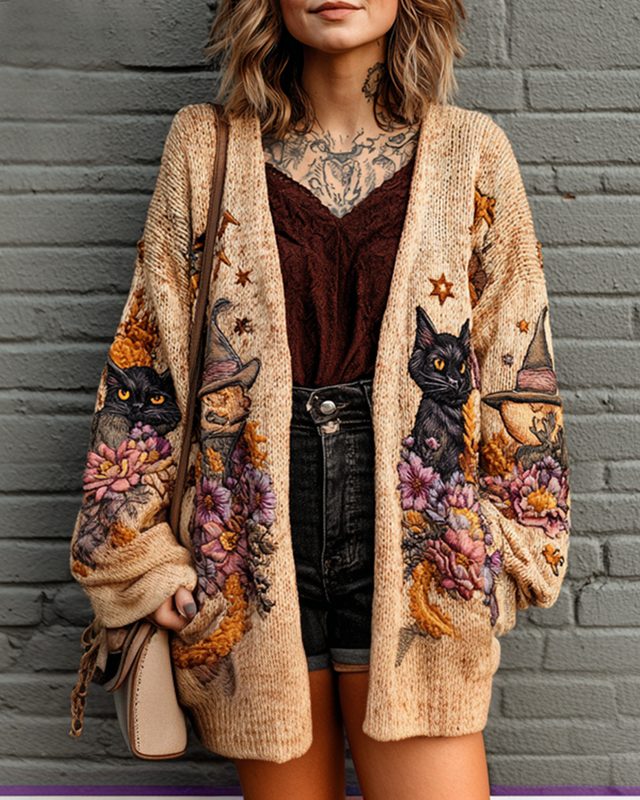 Women's Halloween themed black cat embroidered knitted cardigan bfd9