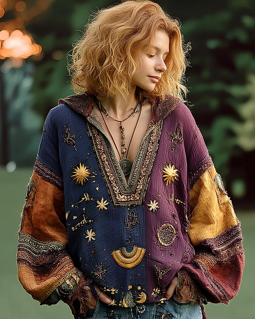 Women's Star and Moon Embroidered Contrast Color Panel Hoodie c10c