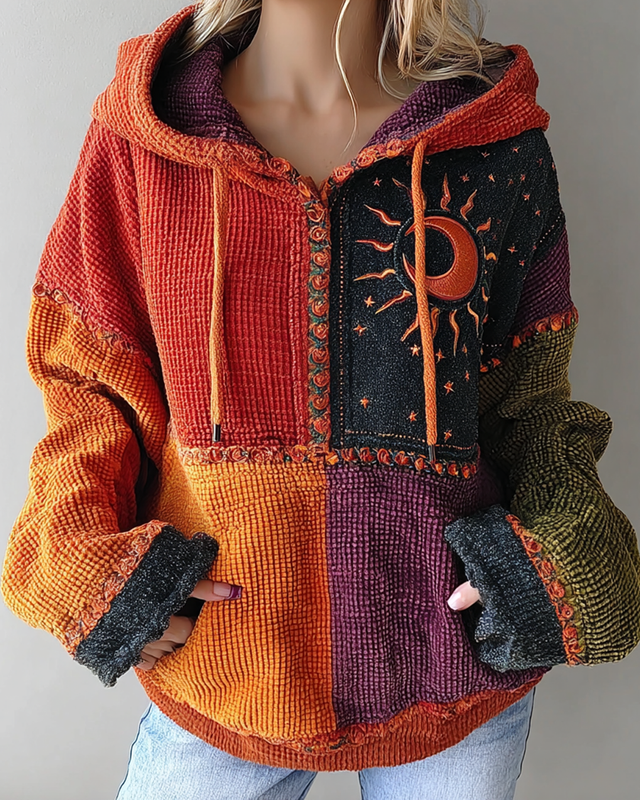 Women's Star and Moon 3D Embroidered Contrast Color Stitching Hooded Sweatshirt 9fa9
